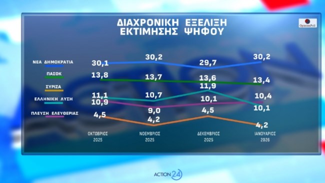 Η Νέα Δημοκρατία συγκεντρώνει ποσοστό 30,2% με το ΠΑΣΟΚ να ακολουθεί στη δεύτερη θέση συγκεντρώνοντας 13,4%. Μάχη για την τρίτη θέση δίνουν οι Κυριάκος Βελόπουλος και Ζωή Κωνσταντοπούλου.
